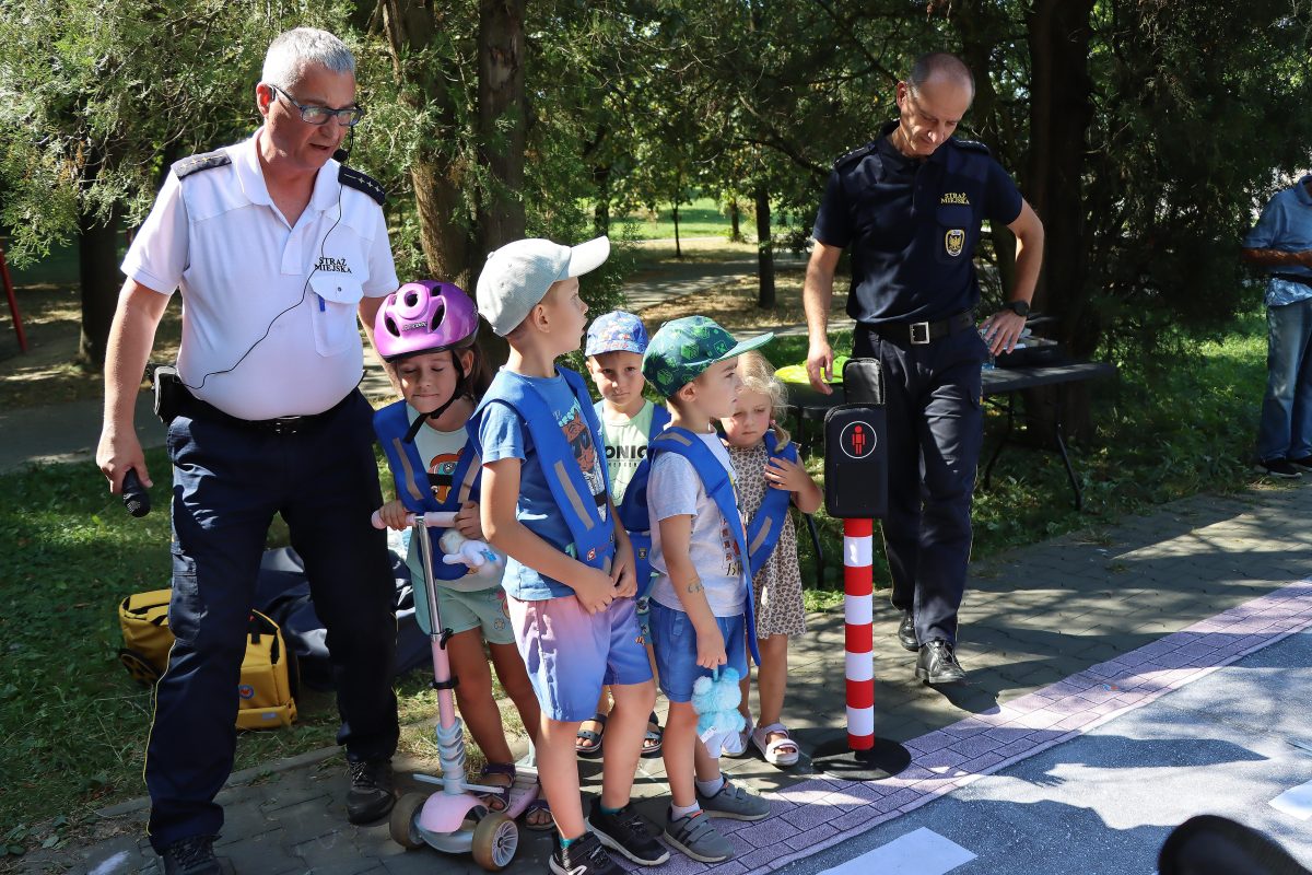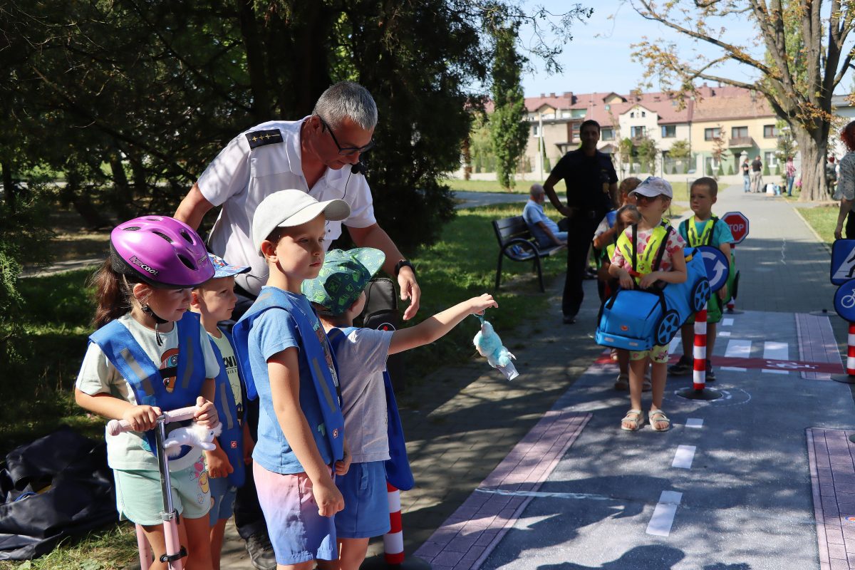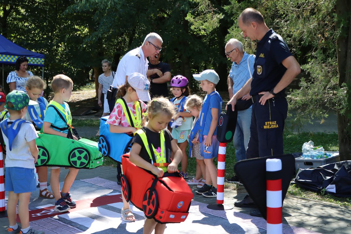 - Dla najmłodszych przygotowano „mini ulicę” z przejściami i pojazdami, gdzie dzieci mogły w praktyce uczyć się zasad bezpiecznego poruszania się.