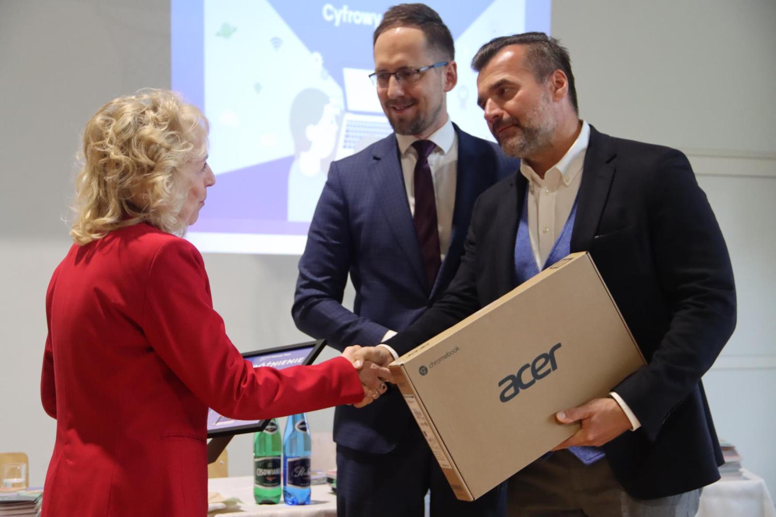 Za wysokie osiągnięcia w kampanii edukacyjnej “Cyfrowy Start”, Bogusława Kudła odebrała nagrodę w postaci laptopa, który został jej wręczony podczas wydarzenia promującego kompetencje cyfrowe nauczycieli i uczniów.