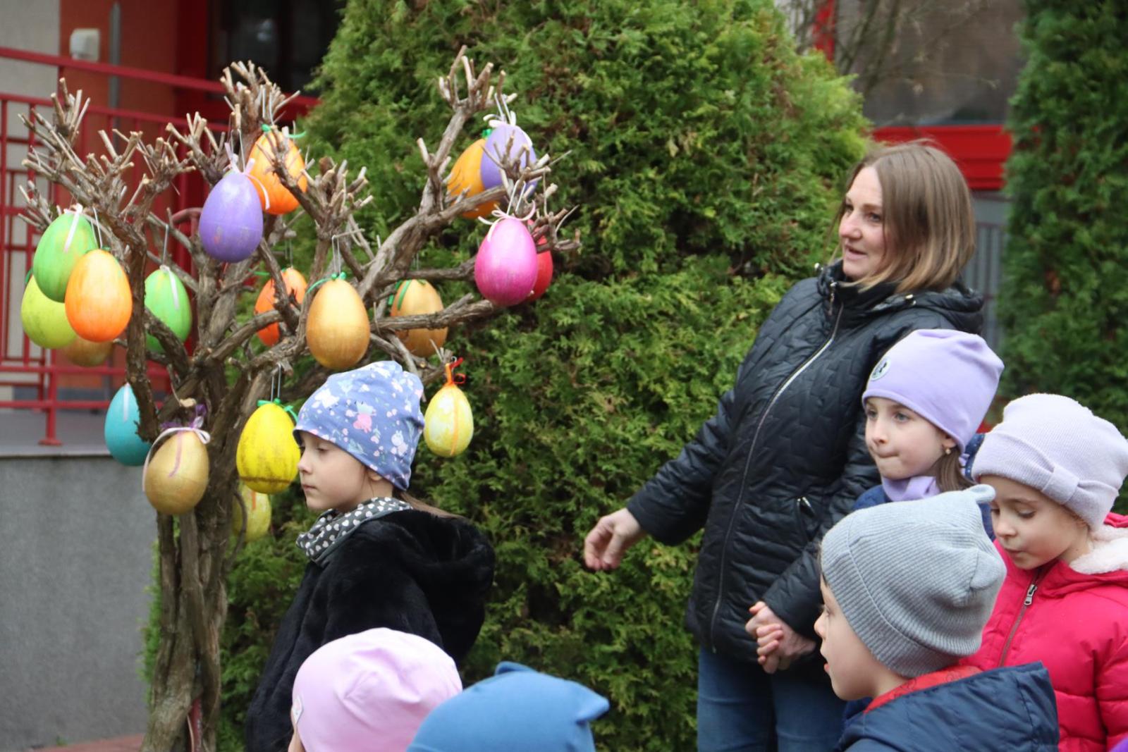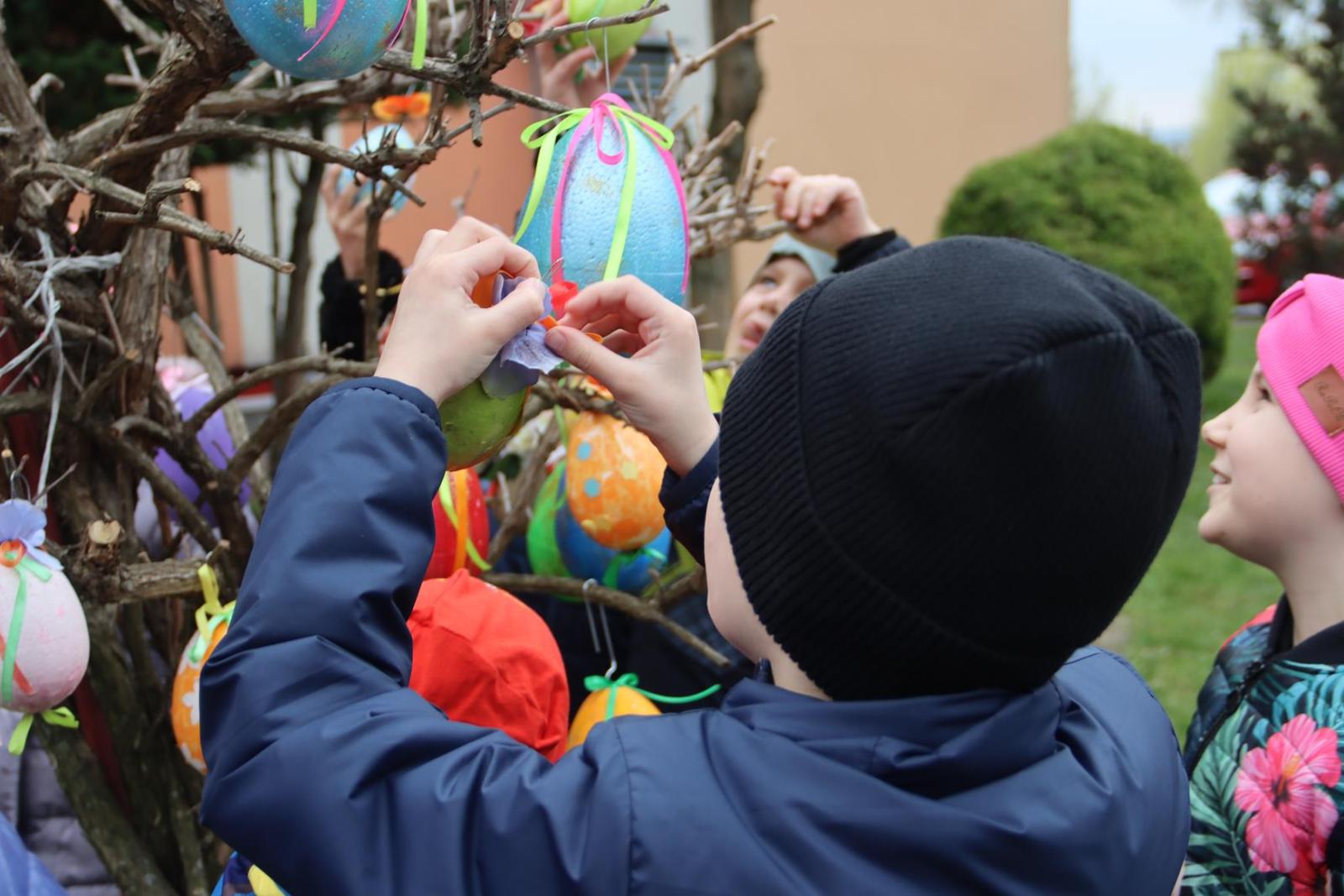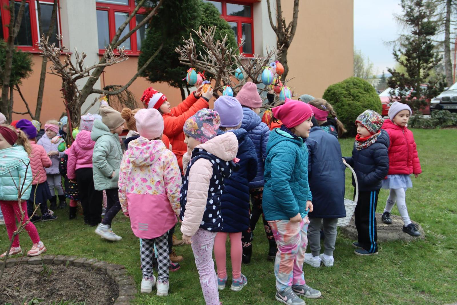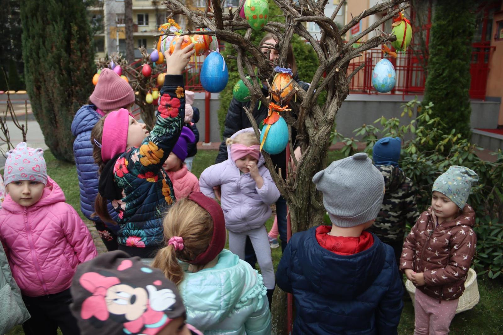 Przedszkole Publiczne nr 32 w Tarnowie – dzieci dekorują pisankami przedszkolny ogród. Widać, że nadchodzi wiosna i czas Wielkanocy.