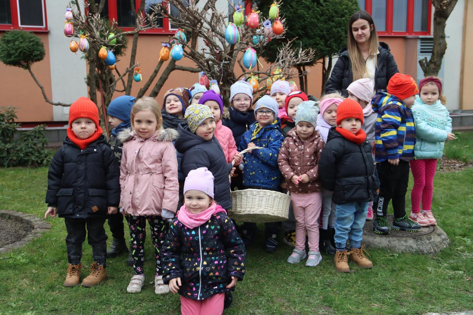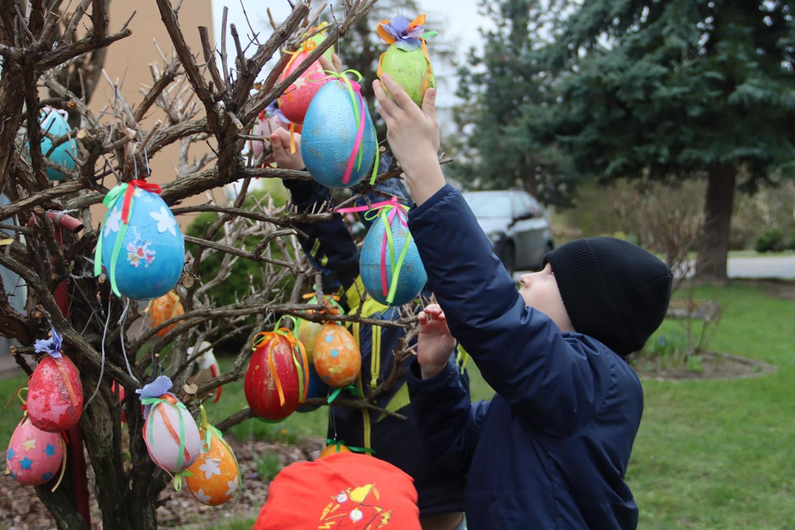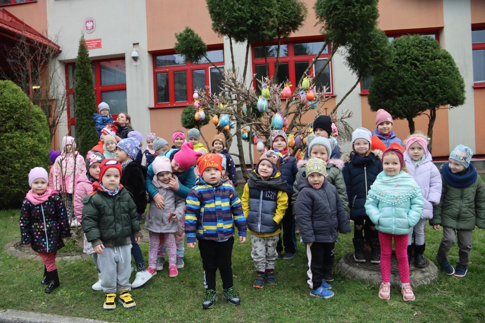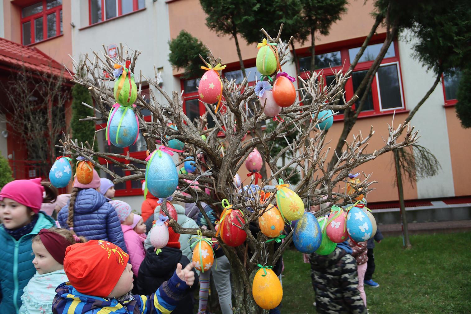 Przedszkole Publiczne nr 32 w Tarnowie – dzieci dekorują pisankami przedszkolny ogród. Widać, że nadchodzi wiosna i czas Wielkanocy.