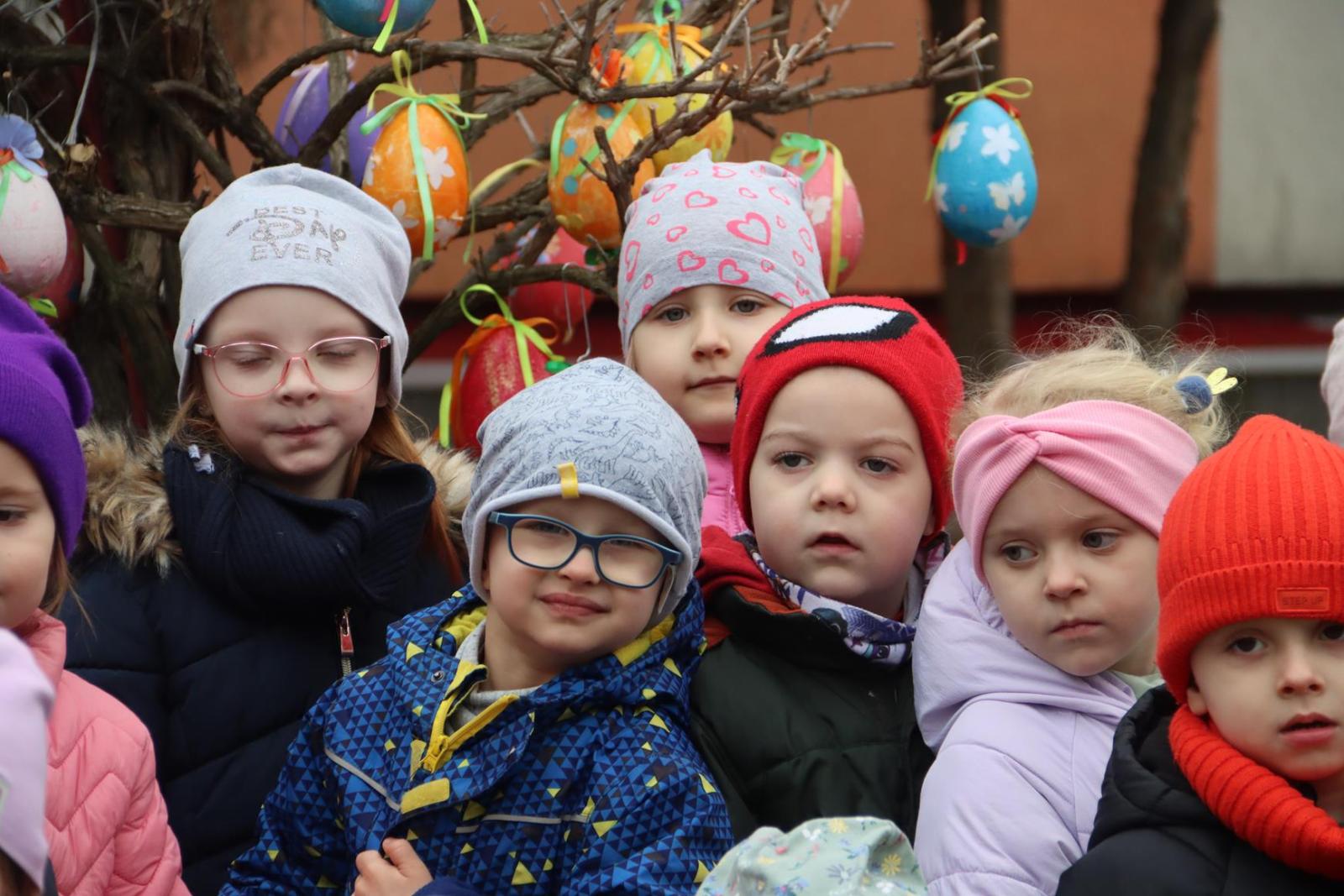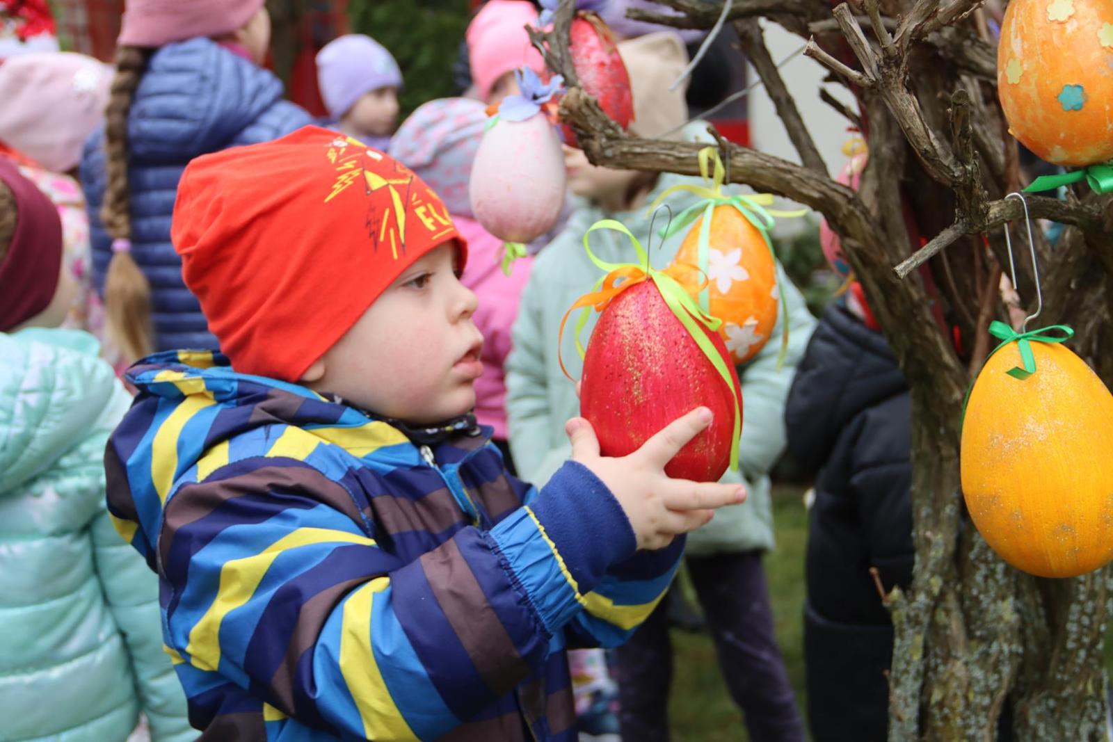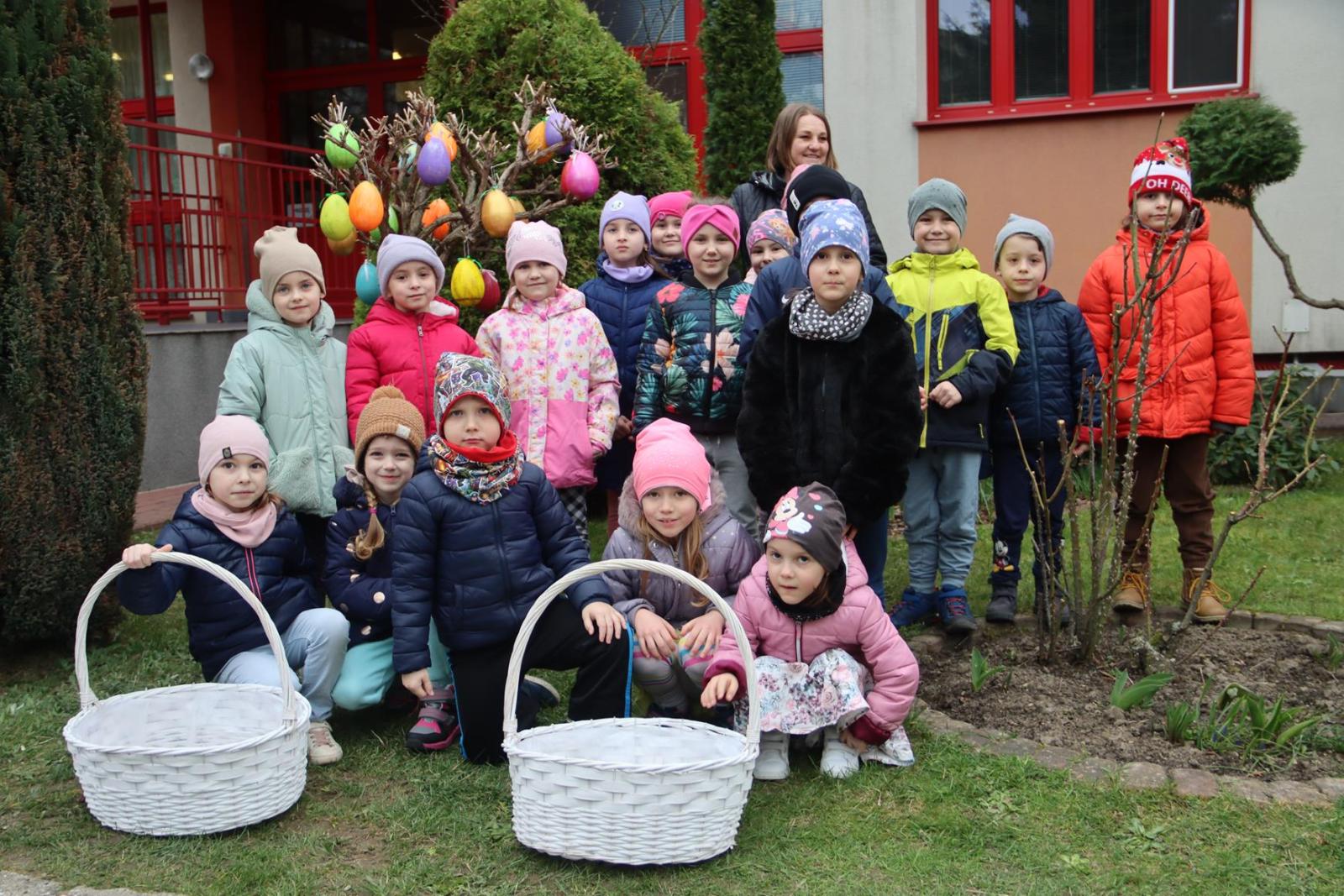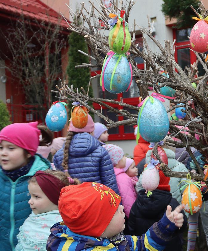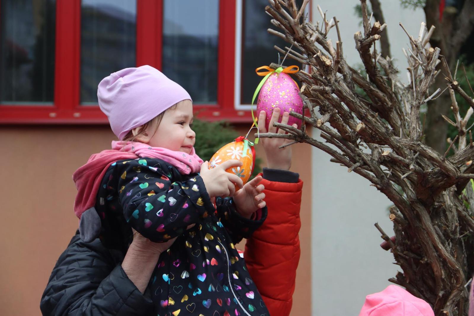 Przedszkole Publiczne nr 32 w Tarnowie – dzieci dekorują pisankami przedszkolny ogród. Widać, że nadchodzi wiosna i czas Wielkanocy.