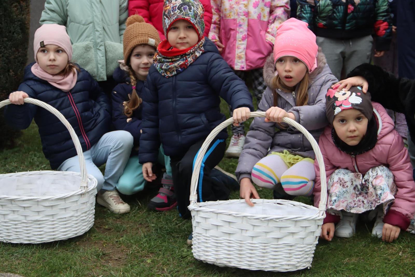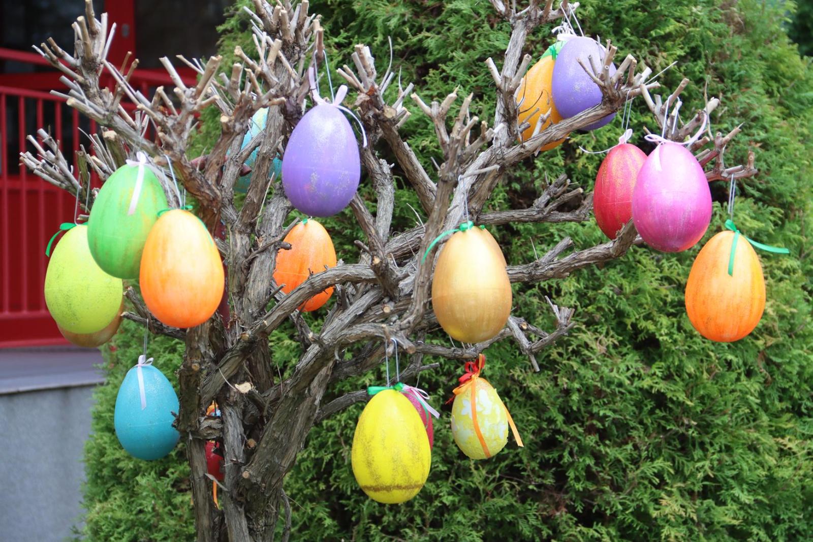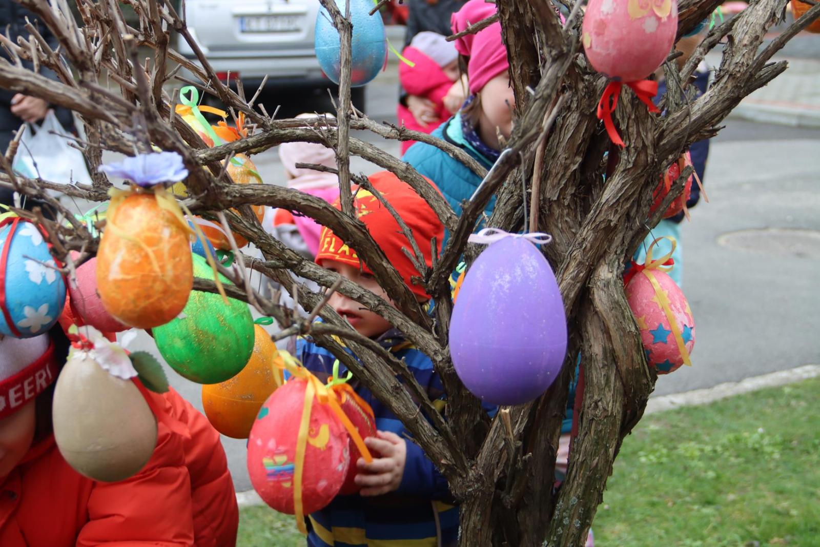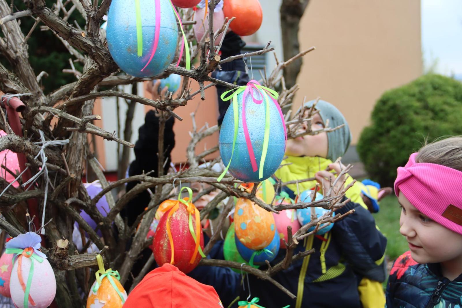 Przedszkole Publiczne nr 32 w Tarnowie – dzieci dekorują pisankami przedszkolny ogród. Widać, że nadchodzi wiosna i czas Wielkanocy.