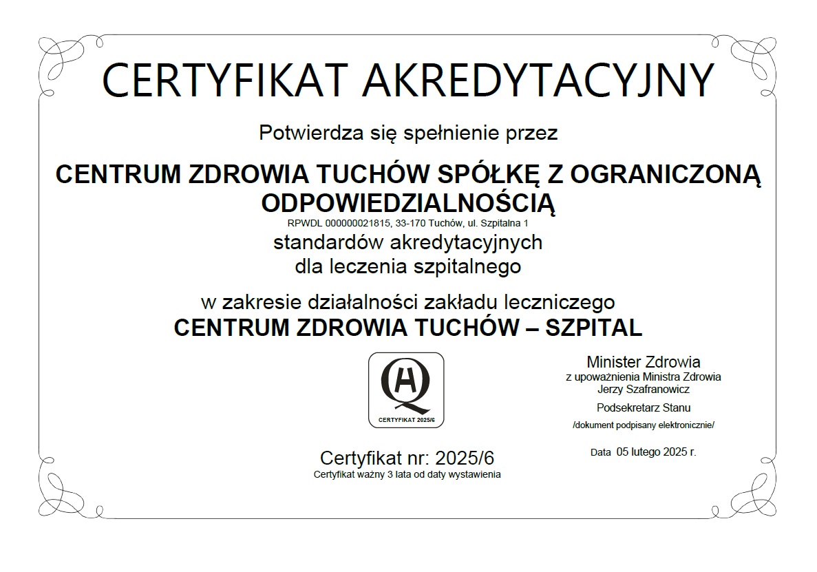 Stosowanie nowoczesnych procedur leczniczych, wysoki poziom świadczonych usług i działania na rzecz poprawy jakości oraz bezpieczeństwa pacjentów. O tym wszystkim świadczy akredytacja Ministerstwa Zdrowia, którą dla świadczeń szpitalnych uzyskało właśnie Centrum Zdrowia Tuchów.