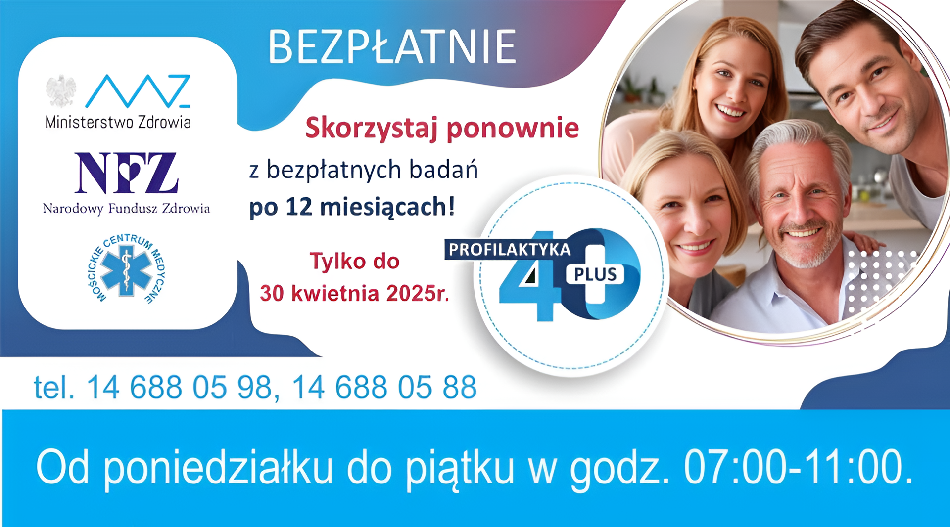 Im bliżej końca realizacji programu Program Profilaktyka 40 Plus, tym bardziej widać zainteresowanie korzystaniem z jego rozwiązań. Tylko do końca kwietnia realizowana jest inicjatywa, która ma na celu poprawę zdrowia osób powyżej czterdziestki, przez wczesne wykrywanie chorób i promowanie zdrowego stylu życia. Więcej szczegółów w Mościckim Centrum Medycznym w pokoju nr 19 lub pod numerem telefonu 14 688 05 98 i 14 688 05 88.