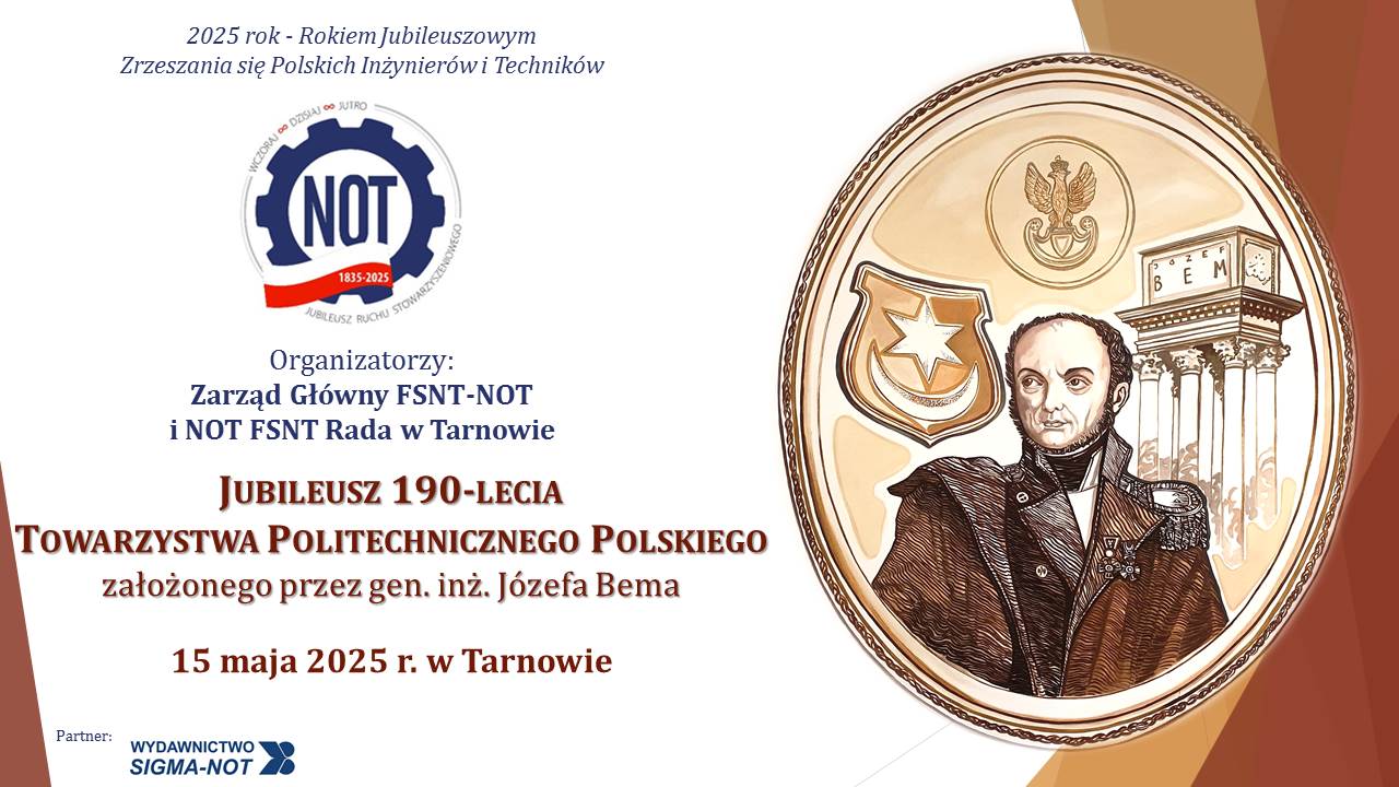 W czwartek, 15 maja 2025 roku, w Tarnowie – mieście urodzin i wiecznego spoczynku generała Bema – odbędą się uroczyste obchody jubileuszu 190-lecia Towarzystwa. W cieniu Mauzoleum, pośród zieleni Parku Strzeleckiego, środowisko inżynierskie złoży hołd swojemu patronowi i ideowemu założycielowi. Następnie, w historycznych wnętrzach tarnowskiego Ratusza, podczas Jubileuszowej Sesji, wybrzmią słowa o przeszłości, odpowiedzialności i przyszłości.
