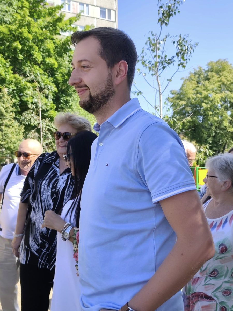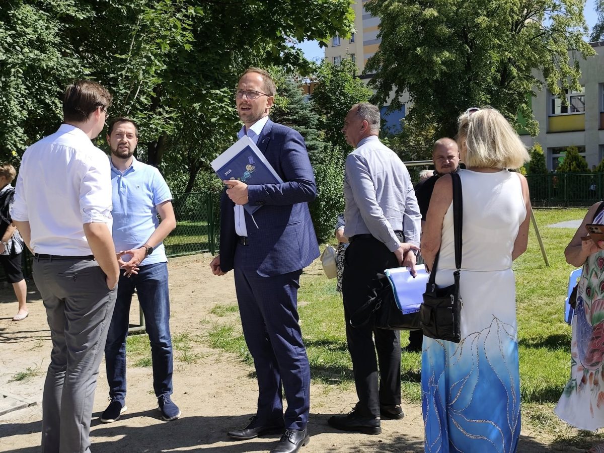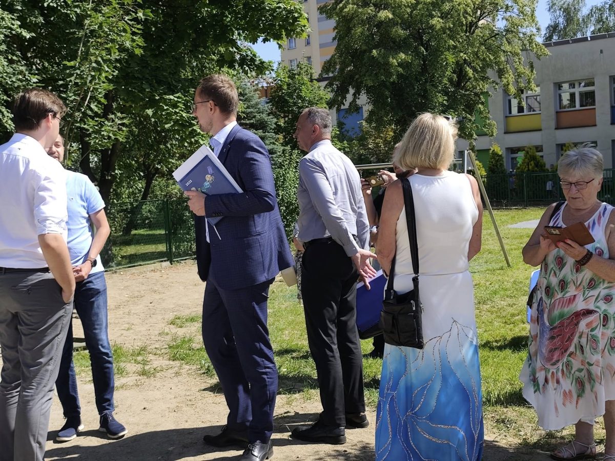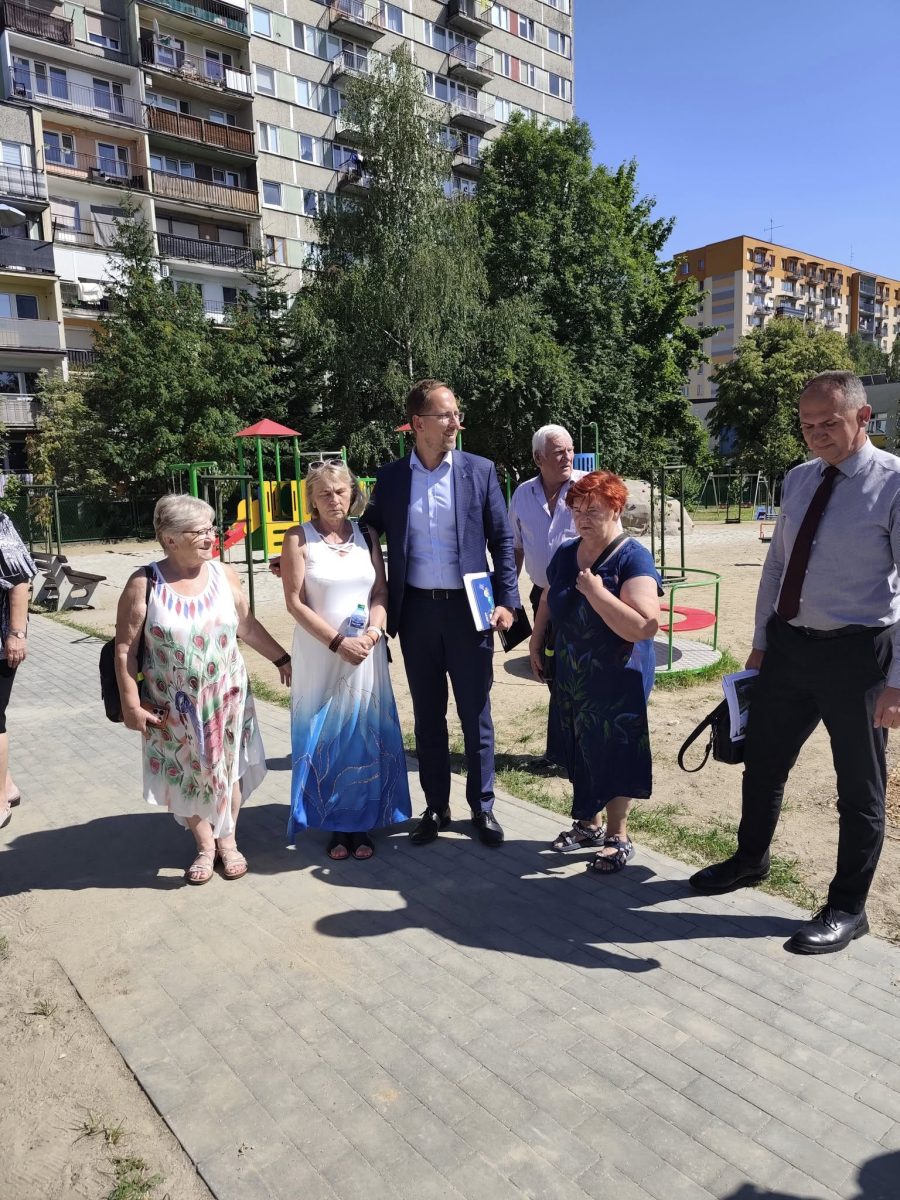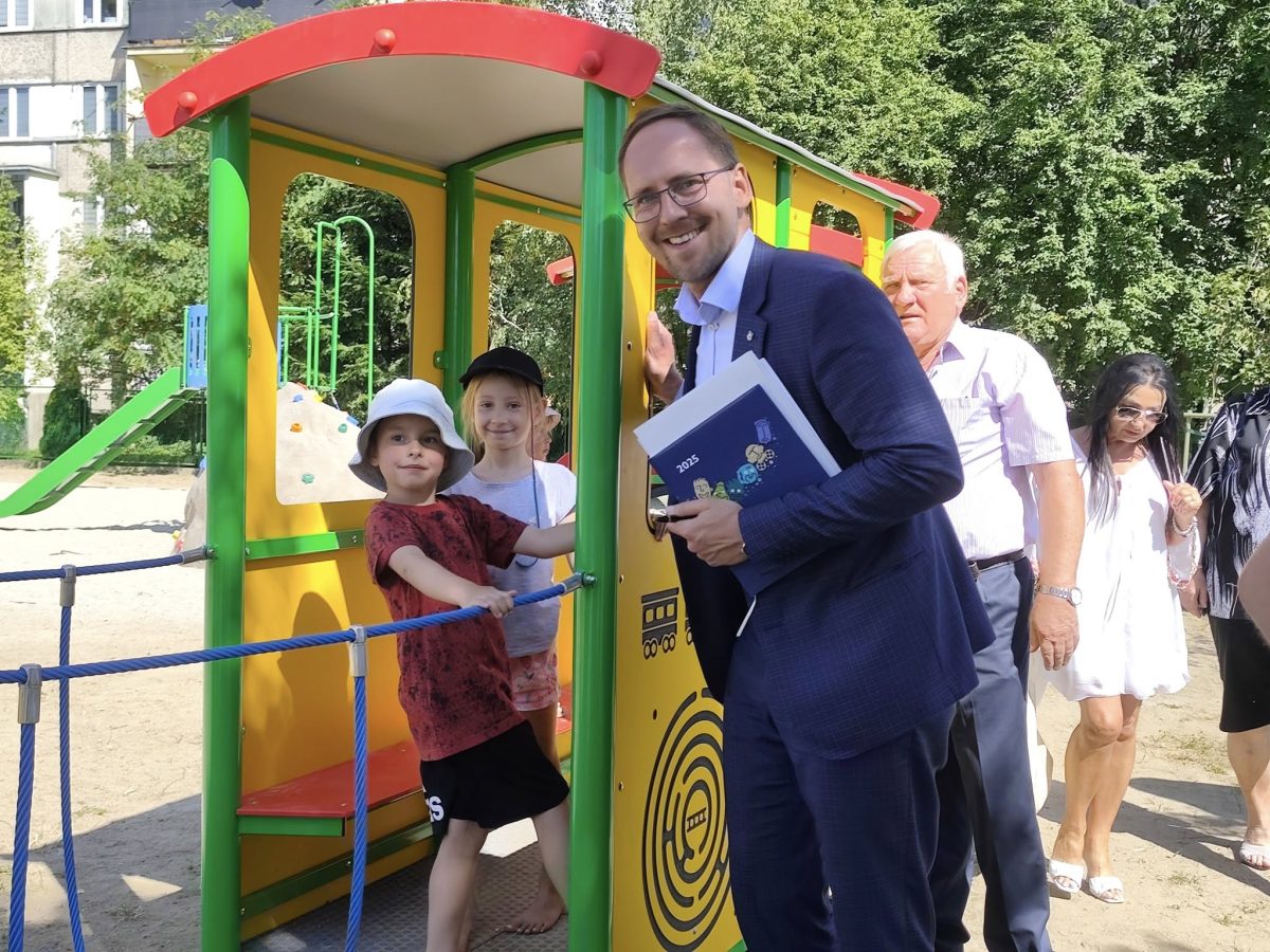 Podczas wizyty prezydent odwiedził nowo oddany plac zabaw, gdzie spotkał się z wykonawcą inwestycji i rodzicami najmłodszych mieszkańców, którzy już korzystają z nowej przestrzeni do zabawy.